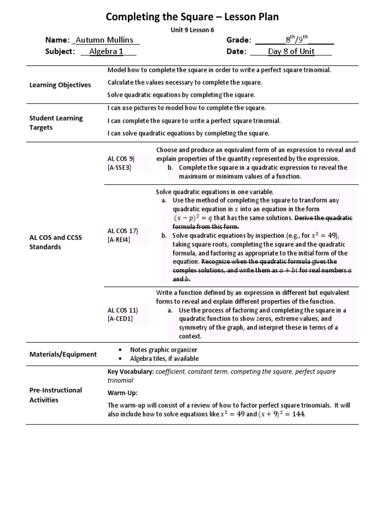 U9l6 Completing The Square Lesson Plan Quadratic Equation Equations How To Write Excel Formulas
